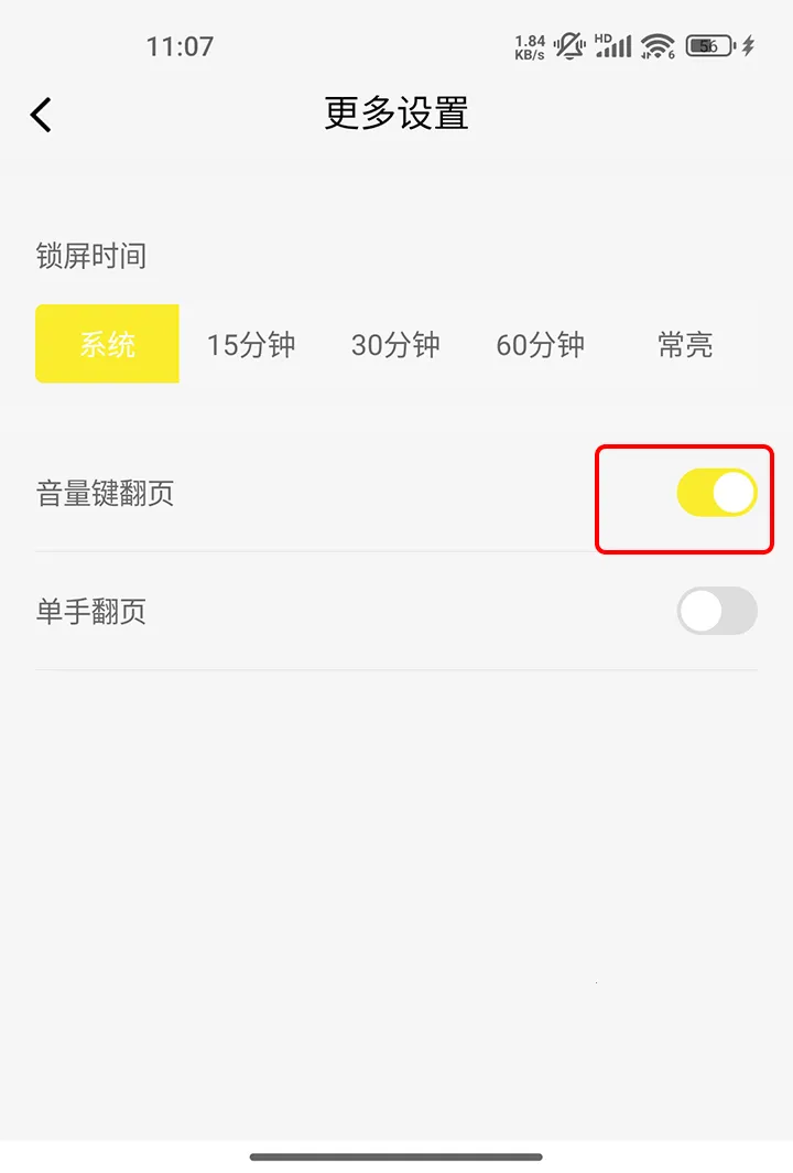 4、开启“音量键翻页”功能即可使用。
