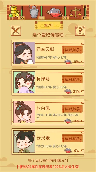 3、面临各种抉择,如选妃、培养太子等,每个选择都影响结果,充满不确定性与新鲜感。