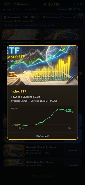 3、投资系统也十分丰富。有39种投资产品,涉及多领域,根据市场情况选择投资,离线时收益也自动累积,每次登录看到资产增值很有成就感,还为后续提供资金保障。