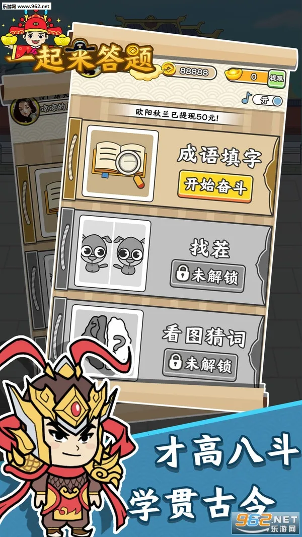 “一起来答题”是一款超有趣的红包小游戏!它能让你在娱乐中收获知识和金钱,实现边玩边学边赚的梦想。游戏里有成语填字、找茬、看图猜词等超多玩法,题库量大,涵盖天文、地理等多方面知识。你可以从底层一步步升官发财,答对题目就能解锁成就,荣誉满满。操作简单,手指点击选项就能答题。还能邀请好友一起比赛,看看谁知识储备量更多。只要成功答题数量够多,积攒的金币就能兑换红包提现哦!而且答对一题就是一种成就,答对越多解锁的荣誉也越多。限时模式很有挑战性,能让你在有限时间内答对更多问题。浓厚的古代传统学堂画风,融入Q萌可爱的背景音效,让你更深入沉浸其中。快来下载,体验答题乐趣,赚取现金红包吧!