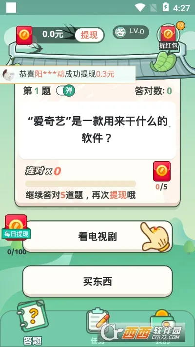 4. 有闯关升级玩法,府邸从草房升至凌霄宝殿,成功答题数量越多积攒金币越多,可兑换红包。
