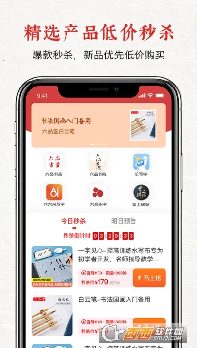 六品堂是书法课程购物平台,主营书法实物销售与互联网教育。有智能分类、特价包邮商品,覆盖丰富视频内容,教学方向广,建立书法生态服务链条,支持线上购物、退换货,还有团购活动。