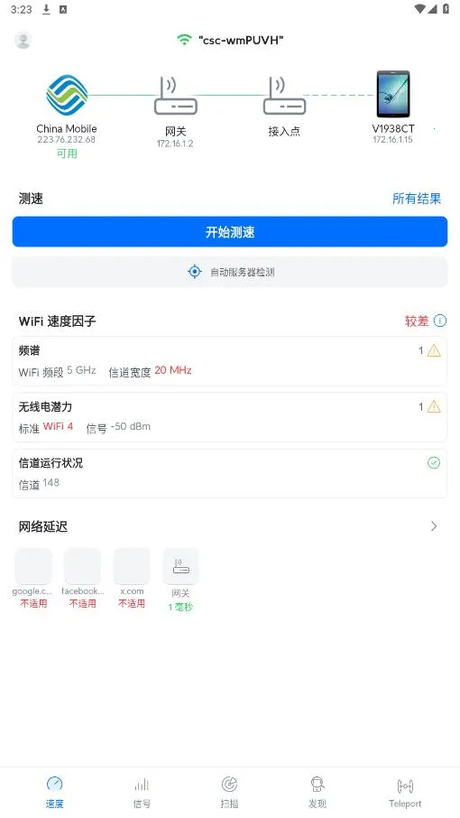 1、WiFiman最新手机版操作十分便捷,一键即可测试网络上传下载速度,还能快速扫描出可连接的网络环境,让你轻松知晓周边网络情况。