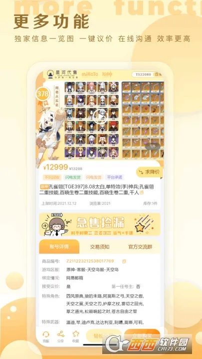 星河代售app是一款专为游戏账号交易打造的合规化平台。它功能超丰富,支持寄售、回收、换号、代售等服务,操作便捷,一键上架。能帮玩家轻松挂出闲置手游账号,平台会帮忙找卖家,账号卖出后货款交付用户。这里有多重安全保障,像人工审核、实名认证、更换手机与邮箱等。还有即时在线沟通系统,支持一键议价,交流高效。平台提供一对一人工客服,手把手指导交易流程,售后更有保障。买家与卖家可自由切换身份,管理订单一目了然。它已接入超9800款热门及小众游戏账号资源,覆盖多个主流游戏厂商账号体系。至于星河代售app下架了吗,目前没有确切消息哦。若你有游戏账号交易需求,不妨试试这款软件,能给你带来不少便利呢。