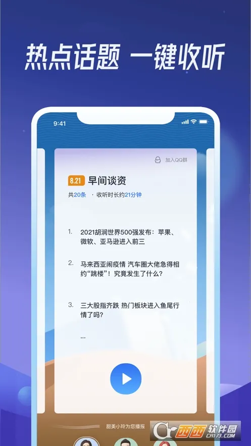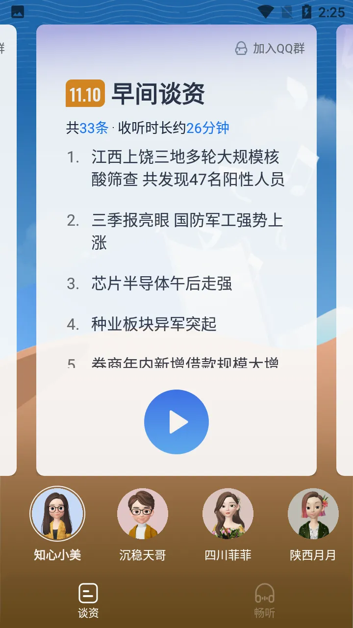 3、其资讯分类众多,涵盖社会热点、互联网热闻、国家政策、金融财经等,每次播报时间在25分钟以上,内容丰富全面。