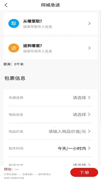 1. 下单很便捷,填写联系人、地址、物品等信息后,即可一键下单同城配送服务,还能随时查询预估价格,参考下单提高配送效率。
