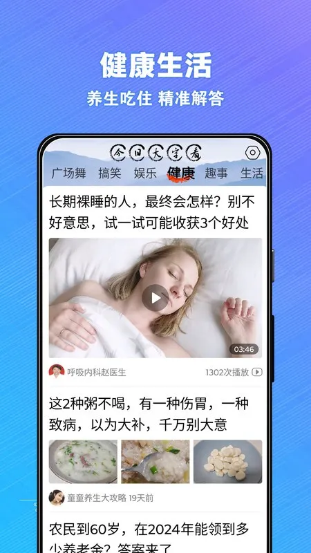 3、返回主界面选择感兴趣的内容板块,如健康或广场舞,上下滑动浏览短视频与文章,点开即全屏播放。