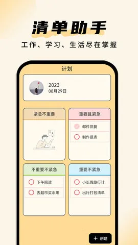 1、操作直观易上手。打开清单助手,能从主界面轻松创建笔记、待办、日记等,快速整理当天安排,灵感随手记或当天任务都能快速保存。