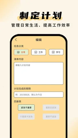 3、分类管理效率高。支持按不同场景分类任务,结合四象限法自动判定优先级;能自定义计划内容与期限,灵活调整执行方式;分开展示未完成和已完成任务,便于长期跟踪效率。