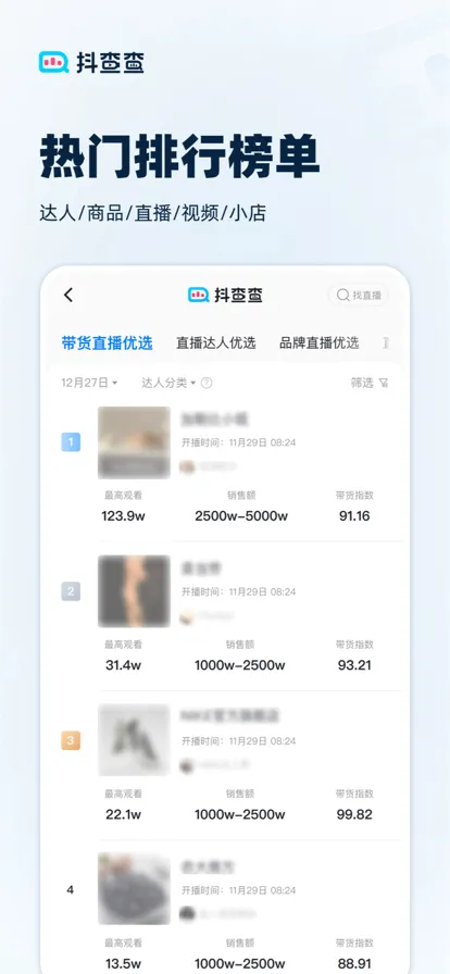 抖查查(短视频分析工具)是一款短视频数据分析工具,软件拥有直播数据监测,直播分析,电商排行,账号分析等等诸多功能,可以帮助用户更好的玩转短视频。