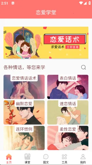 恋爱学堂提供海量恋爱话术,任你搜索,轻松化解尬聊难题。遇到不知如何回复的情况,只需输入关键词,就能快速获取相应话术,让交流更加顺畅。