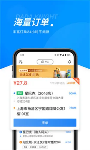 1. **接单自由**:达达骑士采用自由度大的不打卡工作时间,骑手们可根据自己的时间便利安排接单。这里的订单涵盖各个范围,无论是快递、送礼、购物等应有尽有,涵盖各个城市,让骑手们无需担心没有单可接。