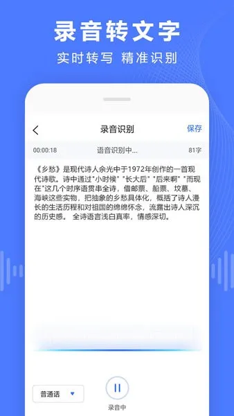 语音文字转换器是一款超实用的手机App。它能把你说的话自动变成文字,使用超方便,一键就能转换。有了它,商务人士开会、访谈时能轻松记录重点,记者、微商培训师采访时可边录边实时转文字,极速创建文档。学生群体用它能提高听课效率,不错过知识点,还能复制文本节省重听时间,通过文档填补上课遗漏。作家和媒体工作者用它能显著提升写作效率。它采用智能语音识别转换技术,支持边录边转换、新建文本识别,还能在线语音转文字,支持主流音频格式。能一次性添加多个语音转换,有多种语音类型可选。而且转换后的数据实时保存,使用方法简单,存储空间大,能帮你保存所有语音文字转换内容,真的是学习、工作、生活中的必备软件,能大大提高效率,赶紧试试吧!