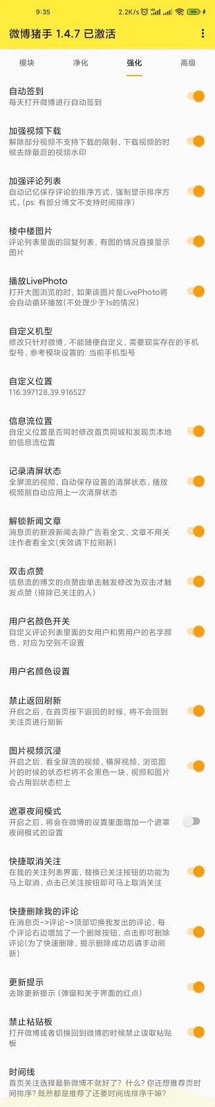微博猪手是一款超棒的微博辅助工具!它能帮你解决不少刷微博的烦恼。功能超丰富,能一键切换多个微博账号,追星女孩再也不用麻烦换号签到啦。还能隐藏图标,把微博图标藏起来,从模块管理器或微博设置中打开猪手设置就行。打开微博,能全自动批量签到全部已关注未签到的超话。下载视频图片时能去除水印,保存无水印的媒体。它能屏蔽各种广告,像开屏、信息流、超话广告等,让浏览更清爽。界面直观又友好,新手也能快速上手。而且它体积小不占内存,运行流畅。使用前手机要解锁BL、刷入面具Magisk并安装LSPosed等虚拟框架,之后按步骤开启模块、设置作用域、重启手机,在猪手APP里个性化设置,再重启主APP,就能享受它带来的便利啦,让你轻松高效玩转微博!