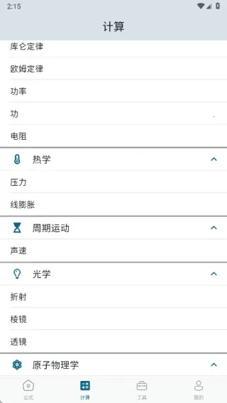 2、其操作流程简洁,无需复杂步骤即可快速查询公式并直接开展计算。进入首页,可见力学、电磁学、热学等分类入口,清晰呈现公式查询方向,选中所需分类点击进入,就能查看对应领域的详细公式内容。