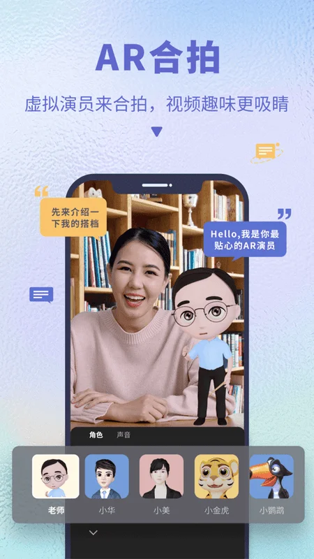 2、趣味拍摄,有AR助播,内置丰富3D虚拟演员,能与主播同框或独立表演,趣味剧情轻松拍。