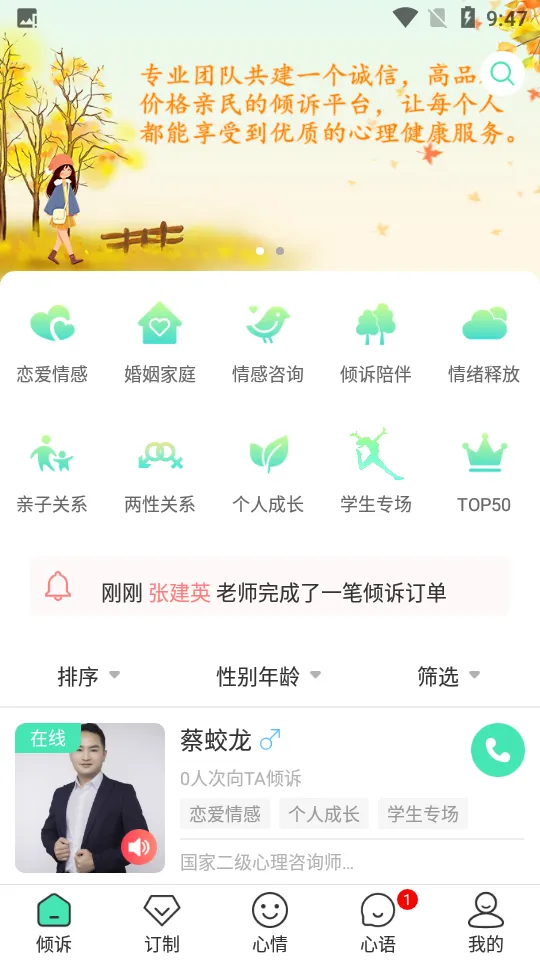 2. 可以根据自身需求轻松选择咨询师。进入应用首页,通过筛选条件,就能找到符合心意的咨询师开启沟通。