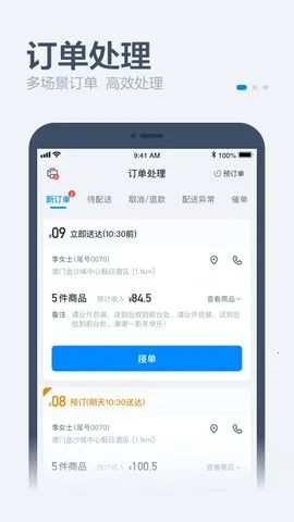 3. 多场景订单处理,多种订单类型分区管理,支持批量接单与批量出库,满足多样需求。