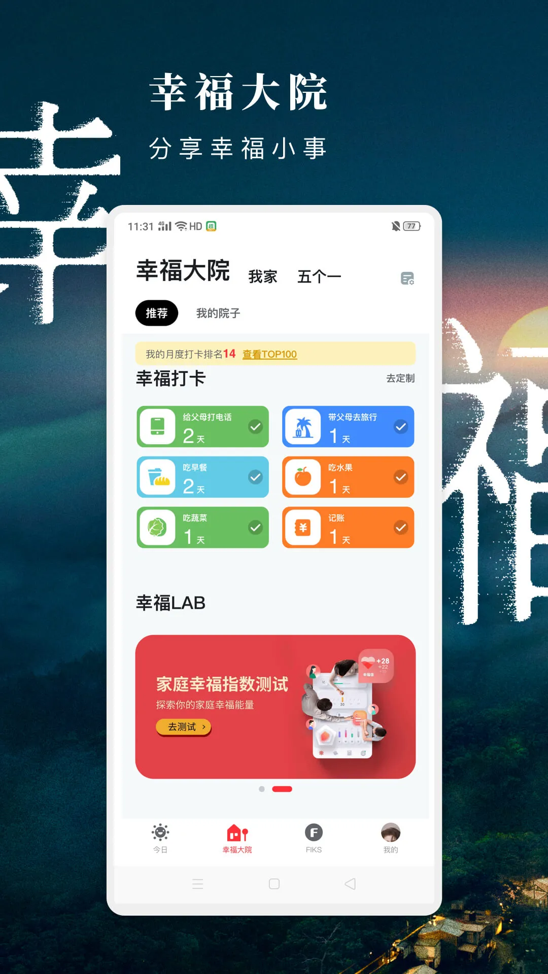 4. **社群互动体验**:幸福大院是用户分享和记录生活 的社群。加入感兴趣的院子,分享心得、参与话题,与伙伴共同提升幸福感,还有话题参与礼物和每日打卡体系,监督养成健康优秀习惯。