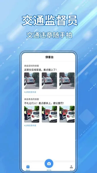 交通违章随手拍2026最新版本是一款让市民可随时拍照举报闯红灯、违章停车等交通违法的平台。支持单拍连拍,自动生成文本,还能查询违章、缴罚款、提申诉,按当地政策领奖励。