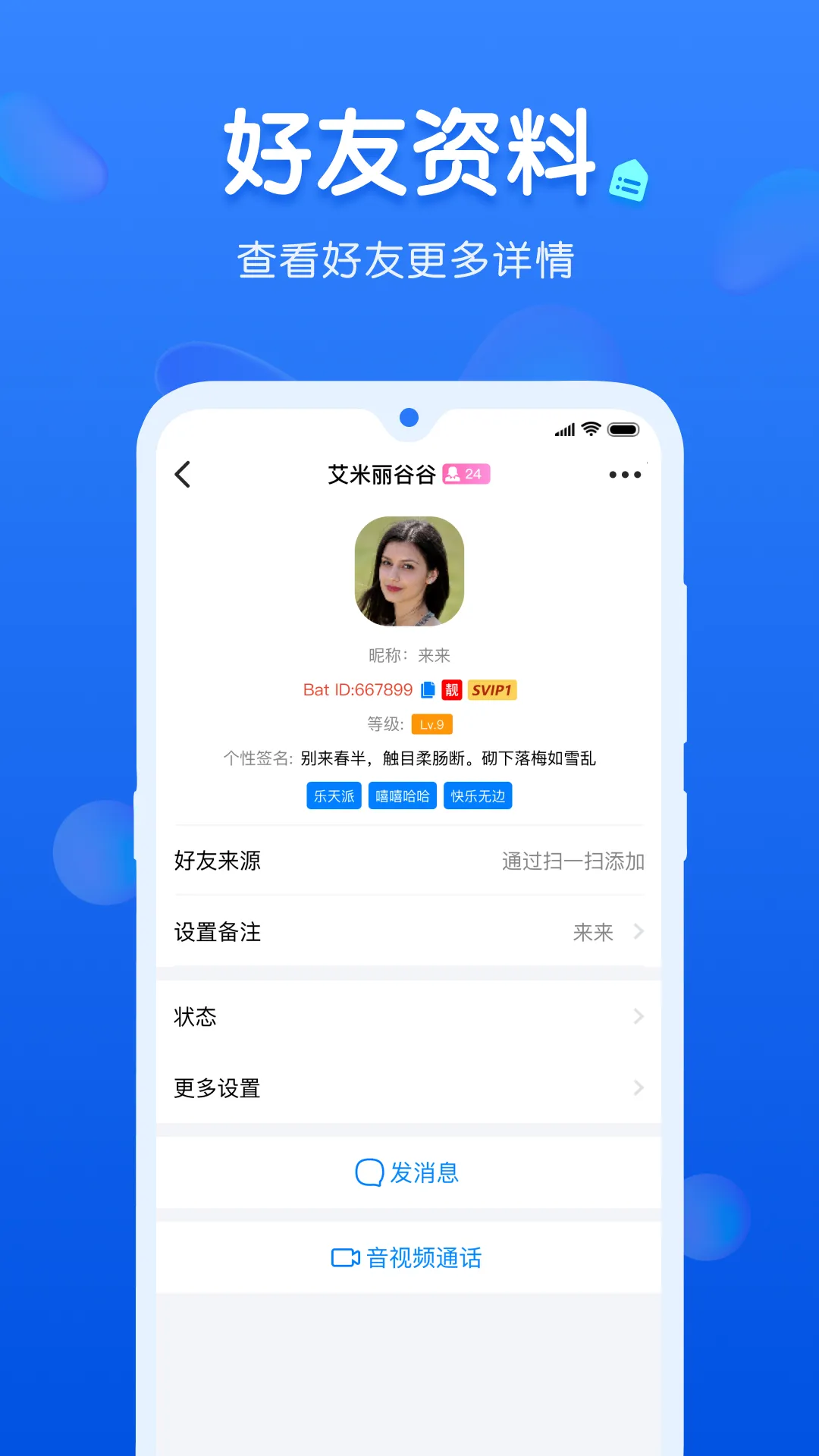 1. 蝙蝠使用起来十分便捷。支持文字、语音、视频等多种聊天方式,不管是和好友一对一单聊,还是在群聊中交流,都能轻松应对,满足多样化沟通需求。