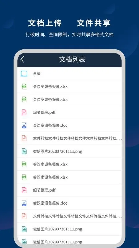 2、微议Pro的文件上传与共享高效,能轻松打破时间与空间限制。主讲人可在线上传多种格式文件分享给朋友,还有板书功能,超多工具助力线上讲解。