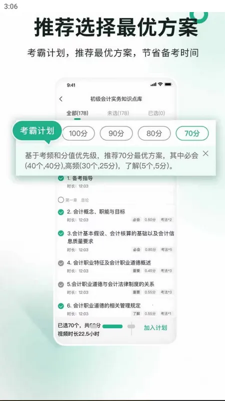 2. 这里的学习计划很贴心。每个知识点标明考频分值和考法,能快选70分、80分、90分等学习计划,满足不同需求。