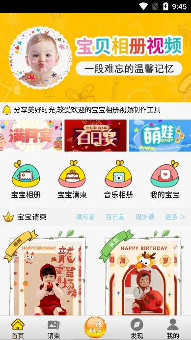 宝宝相册app专注宝宝满月生日请柬、视频MV等在线制作。有一键定制,丰富模板,支持云端同步。能记录成长瞬间,制作精美电子请柬,分享保存美好回忆,助你完成宝宝派对。