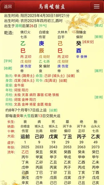 4. 显示出生于节气后的具体天数、具体的交脱大运时间,排盘全面,支持身命宫。