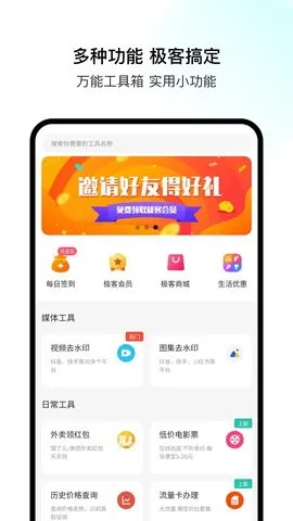极客空间是一款超实用的手机工具箱软件。它功能强大,能满足多种需求。有视频去水印和图集去水印功能,帮你轻松去除视频和图片上的水印,让内容更纯净。电商优惠券功能可助你购物省钱,领取外卖红包能在点外卖时享受优惠。历史价格查询功能,让你清楚商品价格波动,买到性价比高的东西。还有低价电影票功能,帮你低价看大片。它以极简风格原创设计,打造小众化聚合软件分享平台,分享众多网络工具及各类优惠券等网络资源。多种功能集于一身,堪称万能工具箱。实用小功能搭配极简设计,朴素清新。更多功能等你来探索,还有专属客服随时回复,让你用得放心。如果你想轻松解决各种生活和网络需求,那就赶紧下载极客空间吧。