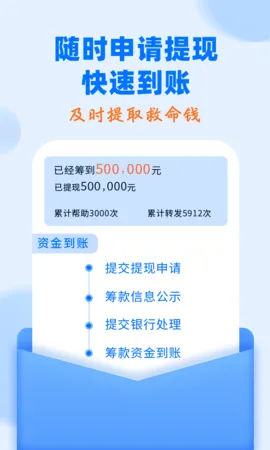 水滴筹是一款超棒的医疗类公益互助平台软件。它能帮用户解决治病救急缺钱的大难题。不管要筹多少资金,在这都能找到帮助。其功能强大,比如有1对1筹款顾问服务,从申请到提现各环节都给指导,每天9点到22点随时答疑,让患者少走弯路多筹钱。申请办理步骤也不难:首先发起筹款申请,要校验发起人姓名和身份证号;接着提交患者与本人身份证正面合照、收款银行卡信息及直系亲属关系证明(患者本人收款无需)、三种以上医疗证明材料(诊断证明必填,其余4选2)、增信材料等;审核通过后就能转发筹款,之后可申请提现。提现很方便,打开水滴筹微信公众号,按菜单操作进入提现界面,提交申请,审核通过有24小时公示期,无异议1 - 2个工作日内资金就到账,而且提现还不收取手续费哦。