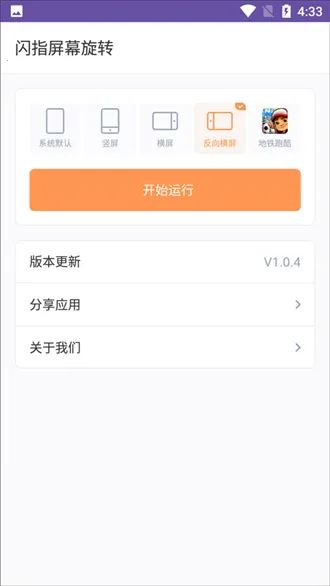 这软件功能强大,能轻松管理屏幕方向,内置功能都能设置操作。还能根据传感器信息旋转,可设置纵向或横向,甚至能把设备屏幕设为反向横向。使用时无需联网,运行前获得必要权限就能自由操作。担心看剧或游戏时屏幕乱变影响操作?用它提前设定好就行,无需任何权限,也不用花钱。无论地铁跑酷哪个版本,都能直接旋转屏幕,让游戏更有趣,感兴趣就赶紧下载体验吧!