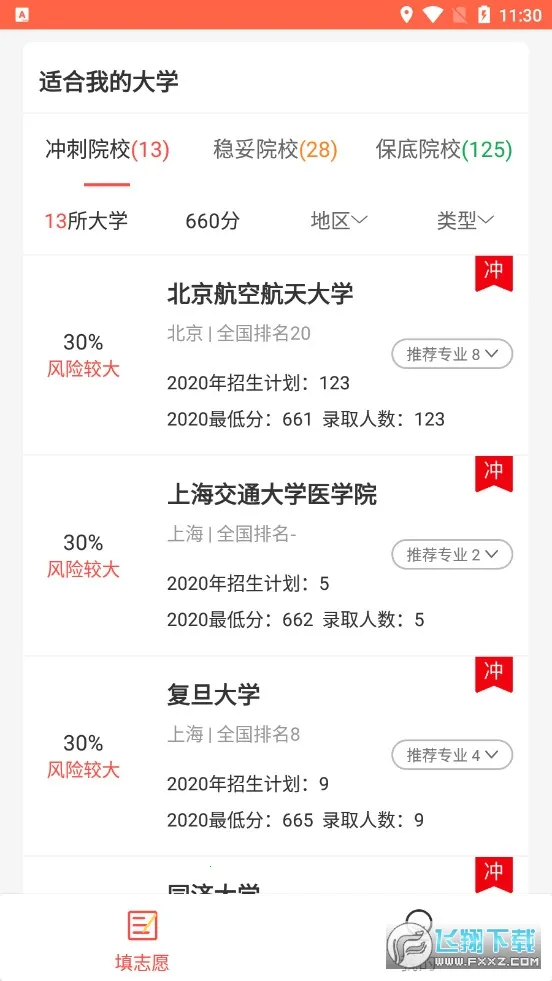 在这里,考生能清楚看到所有功能,享受查询便利,软件还会根据成绩自动提供适合和保底的学校,让考生把握院校录取百分比。