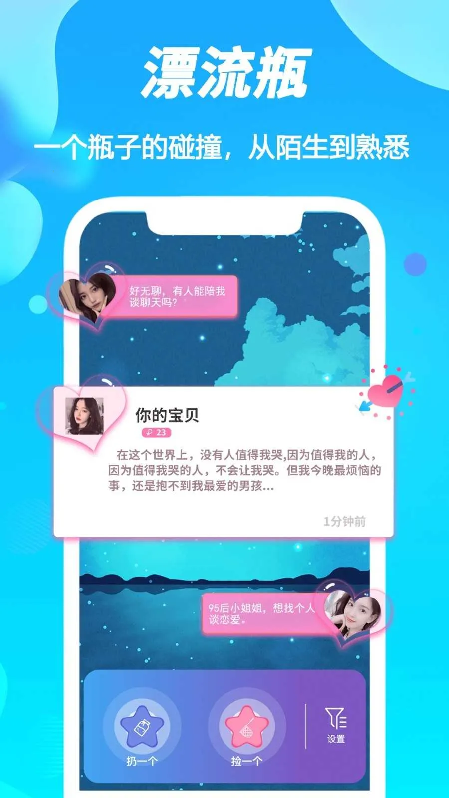 陌声漂流瓶是陌生人交友软件,通过性格三观测试匹配共鸣者。以漂流瓶为核心玩法,支持多种互动形式。有社交广场等功能,界面清晰,审核严格,保留趣味又融入新功能,还有详细使用教程。