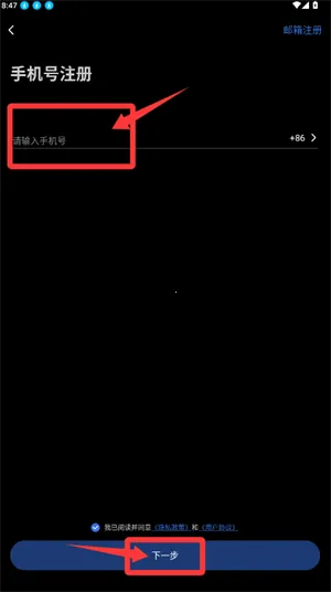 1、在注册页填写手机号并勾选协议,点击下一步。