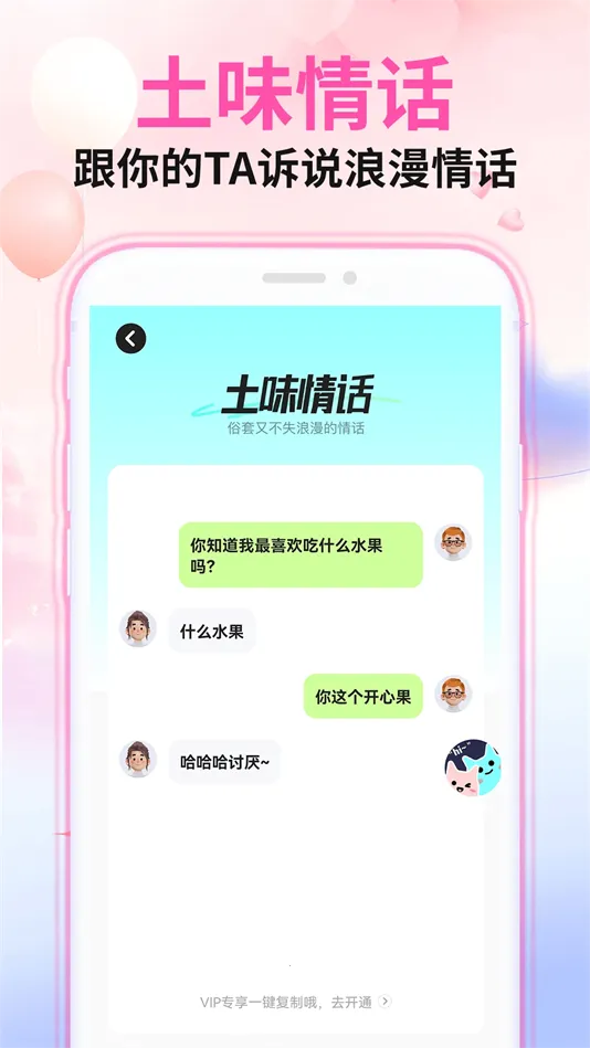 3. 话术持续更新,紧跟聊天需求。不断提升用户聊天水平,让爱意能用更恰当的方式被听见,为恋爱交流注入源源不断的新鲜感,让每一次对话都充满魅力。