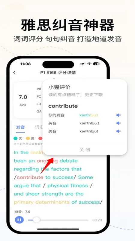 3. 模拟雅思考官评分,从发音、流畅度、词汇、语法四个维度详细测评,清晰了解口语水平。