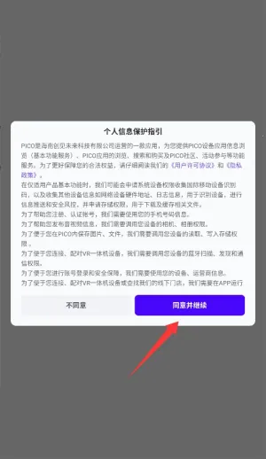 2、pico vr助手操作简单,首次启动同意协议即可进入主界面,登录注册流程便捷。