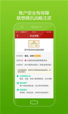 4. 安全性有保障,持有中国证监会首批基金销售牌照,受严格金融监管,还有腾讯、联想等知名企业投资背书,承诺资金损失先行赔付。