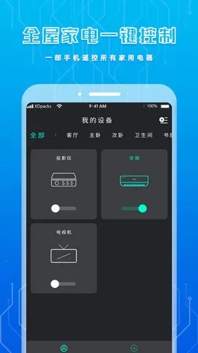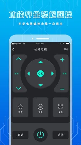 其功能齐全,模拟真机的遥控界面,不仅能开关,还能操作换台、调声音大小、调温度等。还能一键控制全屋家电,智能保存适配成功的遥控型号,下次一键开启无需再次适配。它涵盖多达12个家电品类,真正做到了遥控大全。