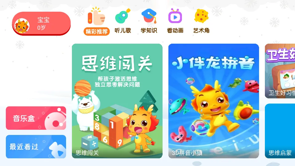 2、软件完美适配电视盒子,还能进行投影,可让孩子提前接触课堂知识。并且拥有丰富的原创和教育资源,不断引进优质儿童内容,能成为陪伴孩子成长的好伙伴。
