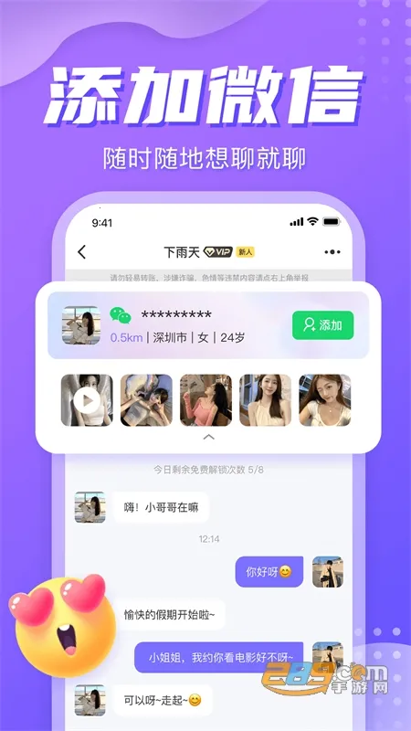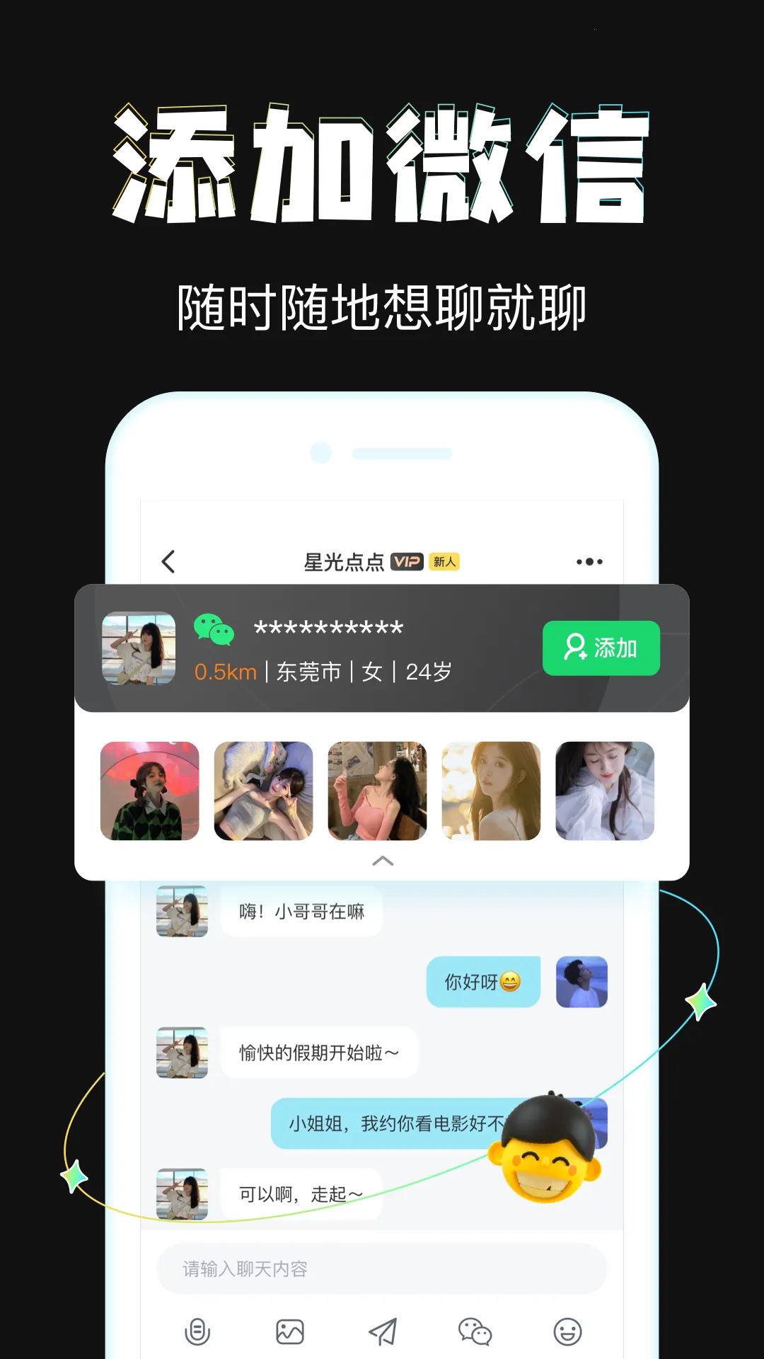 其交友方式十分便捷。支持在线同城语音视频交友聊天,还有多人在线语音派对,让陌生人交友变得有趣,能快速约会附近的人,添加微信随时畅聊。