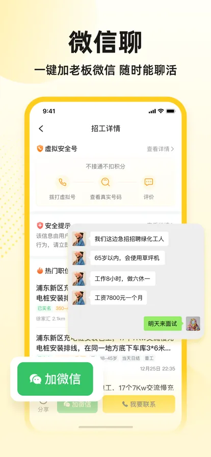 4. **安全保障很贴心**:这里所有工作都经过检测,有安全保障。信息全面且工资高、招聘快、入职快,为用户提供精准高效安全的招工找活信息。