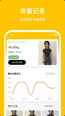 体重相册最新手机版是一款自由体重记录app,可记录每日体重、饮食、卡路里摄入,通过BMI计算数据。能连接体重秤,有体脂分析等功能,提供个性化建议,助你管理身材、掌握健康。