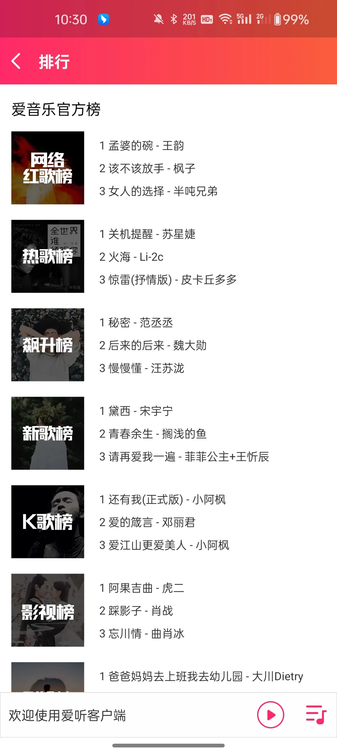 爱听音乐网2t58能满足你对音乐的多样需求。它就像一个丰富的音乐宝库,拥有海量正版歌曲MV资源,涵盖热门影视剧原声、火爆综艺金曲、网络热门神曲及最新流行歌曲等。这里有独特的推荐算法,比你更懂你的音乐品味,为你找到更多好音乐。你能免费在线收听,也可将音乐下载到本地设备离线收听。还能享受免费的优质音质,无损音乐让耳朵尽情享受。你可以通过搜索歌名、歌手或专辑名快速找到想听的歌,其搜索功能强大又高效。而且它支持单曲循环、列表循环、随机播放等多种播放模式,满足不同听歌需求。此外,它还有社交互动平台,数万粉丝聚集,歌友每日分享歌单,听歌交友两不误,让你轻松发现新音乐,享受音乐的无限魅力。