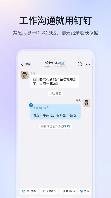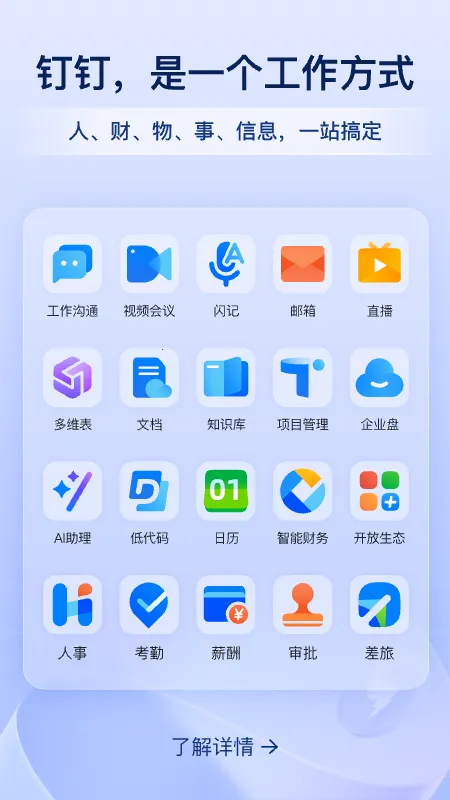 2、功能全面实用:涵盖聊天、办公软件、电话、钉盘钉邮等诸多功能。聊天功能沟通顺畅,办公软件满足日常办公需求,电话功能多样高效,钉盘钉邮方便文件存储与邮件处理,全方位助力工作。