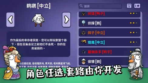 《鹅鸭杀官方正版下载最新版》拥有丰富多样的角色供玩家选择,每个角色都有独特技能,比如警长能杀人、鸽子可感染他人,极大丰富了游戏策略性。