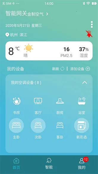 它的功能丰富。不仅可以控制空调的温度、风向、模式、定时等,还能监测室内温度、湿度、PM2.5、CO2、VOC浓度等空气参数,当指标超标时会发出通知提醒。