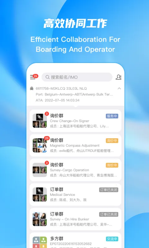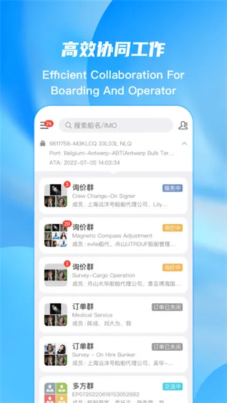 2、ePorts支持跨角色创建聊天群组,借助智能船舶定位及追踪服务,不断提升企业的服务品质及执行效率。代理人能随时了解客户任务分配,接收服务各环节进展预警,即时沟通并创建协作群组,快速了解任务变化。