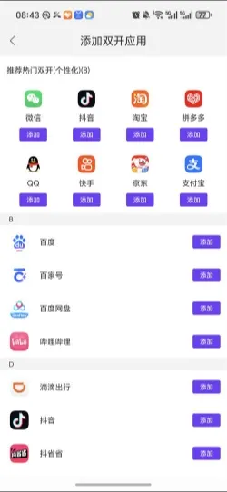 4.进入应用列表,选择要双开的应用,点击右侧【添加】;